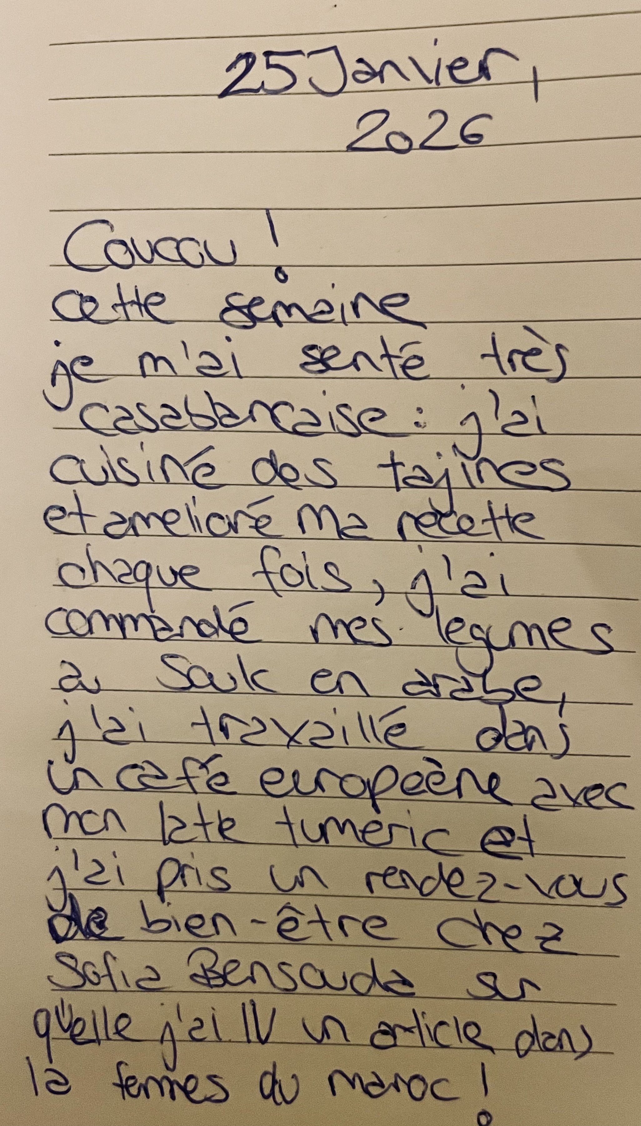 Hello! This week, I felt very Casablanca-esque: I cooked tagines and improved my recipe each time, I ordered my vegetables at the souk in Arabic, I worked in a European café with my turmeric latte, and I made an appointment at a wellness centre run by Sofia Bensouda, whom I read about in an article in Femmes du Maroc!