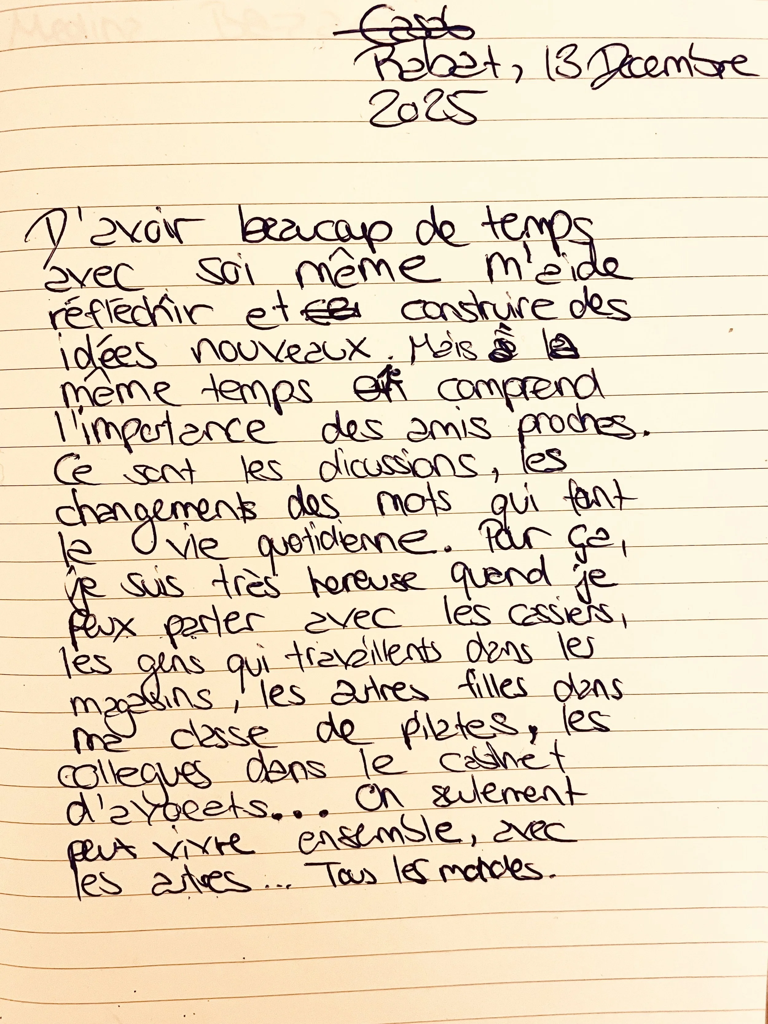 Passer beaucoup de temps avec moi- même m’aide à réfléchir et à developer des nouvelles idées. Mais au même temps, je comprends l’importance des amis proches.Ce sont les discussion, les échanges qui constituent la vie quotidienne.C’est pour cela que je suis très heureuse quand je peux parler avec les caissiers, les employés de magasin, les autres filles dans mon cours de pilates. les collègues du cabinet. d’avocats… on ne peut vivre qu’ensemble, avec les autre.. Tous le monde.