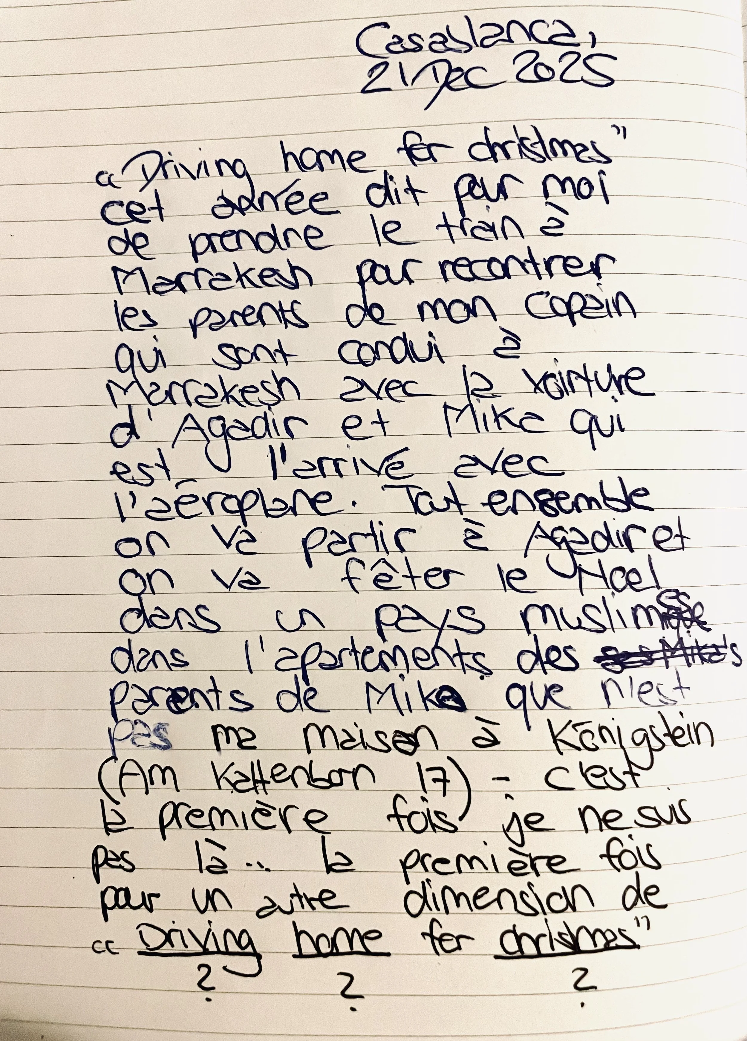 „Driving home for Christmas” bedeutet dieses Jahr, mit dem Zug nach Marrakesch zu fahren, um dort die Eltern meines Freundes zu treffen, die mit dem Auto aus Agadir angereist sind, und Mika, der mit dem Flugzeug gekommen ist. Wir fahren alle zusammen nach Agadir und feiern Weihnachten in einem muslimischen Land in der Wohnung von Mikas Eltern, nicht bei mir in Königstein (Am Kaltenborn 17) – es ist das erste Mal, dass ich nicht dabei bin ... das erste Mal für eine andere Dimension von „Driving home for Christmas”.